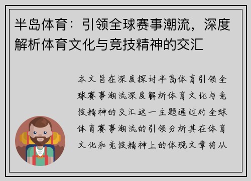 本文旨在深度探讨“半岛体育:引领全球赛事潮流,深度解析体育文化与竞技精神的交汇”这一主题。通过对全球体育赛事潮流的引领,分析其在体育文化和竞技精神上的体现,文章将从四个方面进行详细阐述:半岛体育的历史背景与发展轨迹、全球赛事潮流的塑造与影响、体育文化的深度解析、竞技精神的体现与传承。这四个方面将从多个角度展示半岛体育如何在世界范围内推动体育文化的变革与发展,以及其在全球赛事中的深远影响。最后,文章将总结半岛体育在全球赛事潮流中的重要角色,并对未来的发展趋势进行展望。